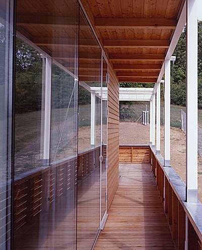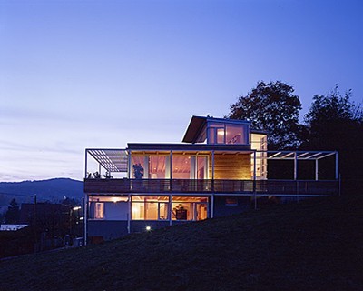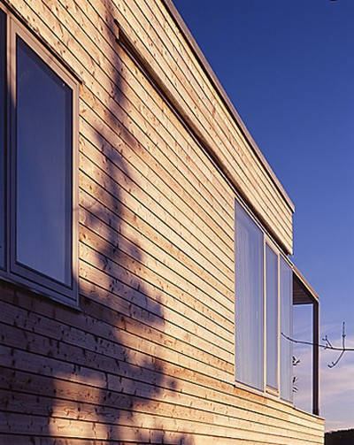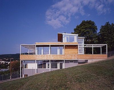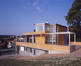 Wände und Decke der 1.Ebene, die erdberührenden Teile der 2.Ebene und die Nordwand des Hauses sind aus Ortbeton mit Wärmedämmung. Der Aufbau der übrigen Außenwände und Decken besteht aus Stahlprofilen als tragende Konstruktion, in die vorgefertigte, hochwärmegedämmte Wandpanele aus Holz bzw. Glas eingebaut wurden. Die Decken sind Holzbalkendecken, eingelegt in die Stahlprofile. Durch die hochgedämmten Außenwandpanele und einer kontrollierten Lüftung liegt der Energieverbrauch des Hauses im Bereich eines Energiesparhauses. (11.06.2001)