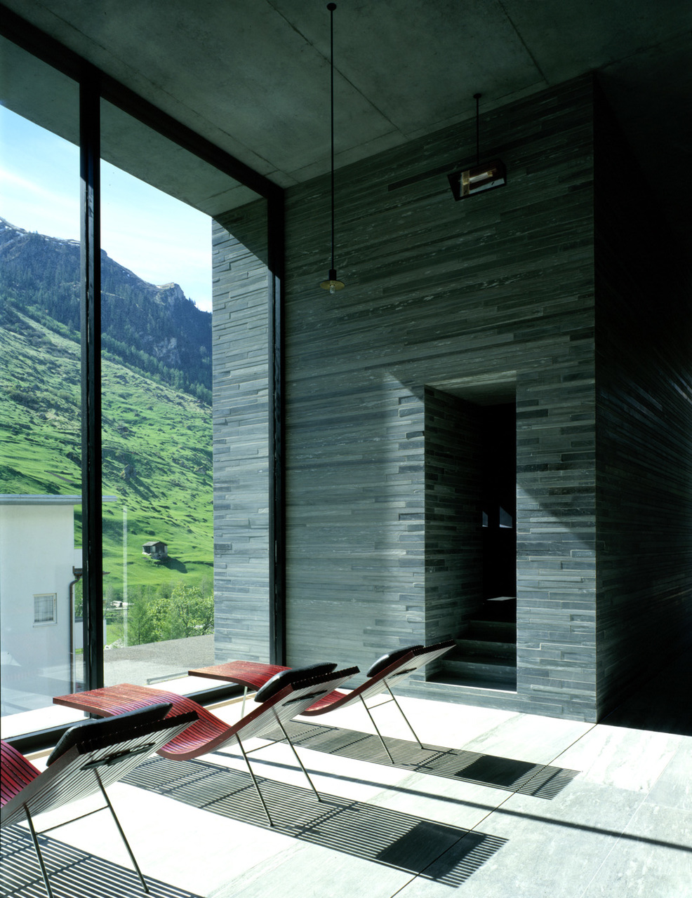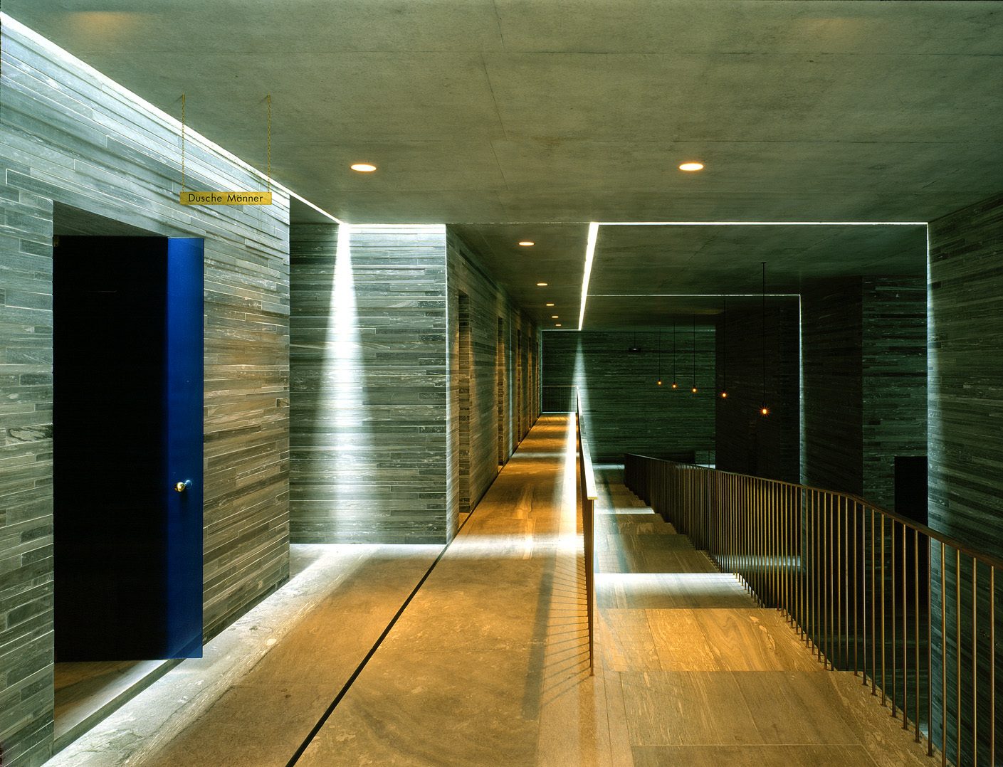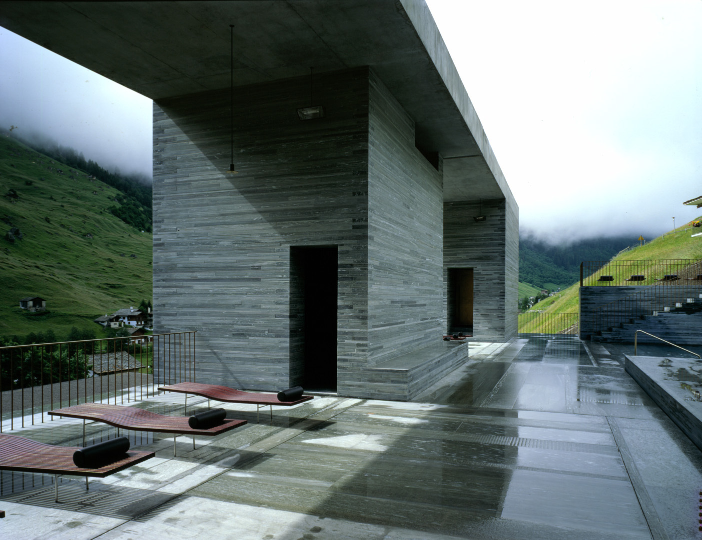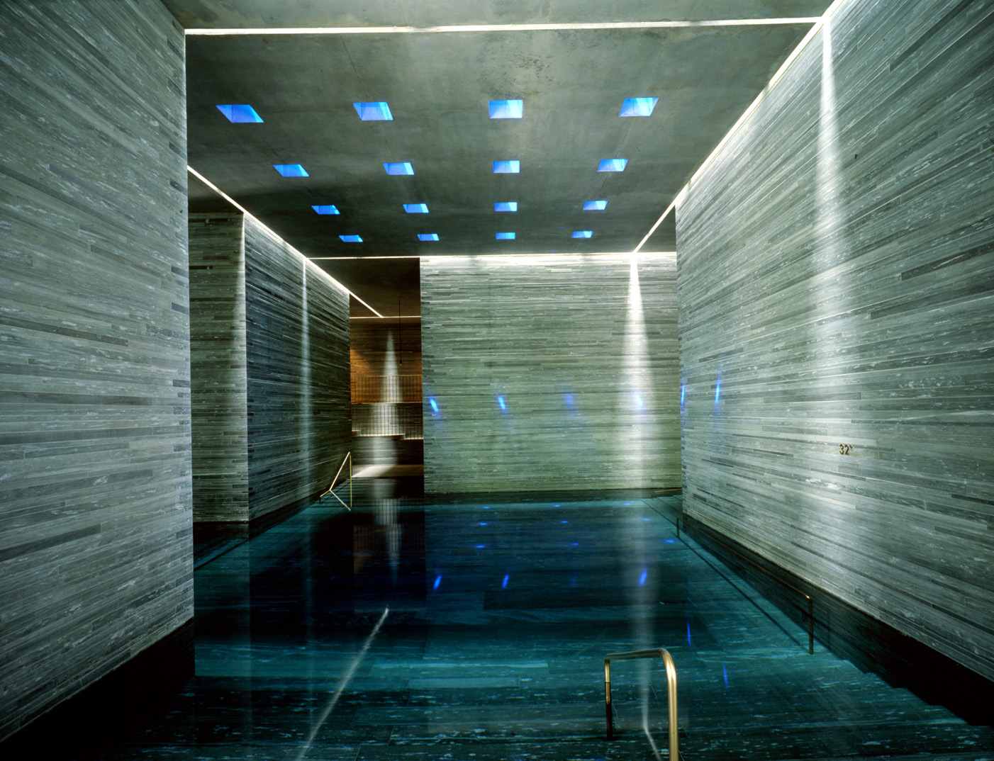 „In der Art eines rechtwinklig ausgelegten Höhlensystems mäandriert ein zusammenhängender Innenraum durch die aus großen freistehenden Steinblöcken bestehende Grundstruktur des Bades“, beschreibt Zumthor in seinem Aufsatz Material und Präsenz. „Die großartige Landschaft des gegenüberliegenden Talhanges, architektonisch gerahmt in riesigen Bildern, strömt ins Innere.“