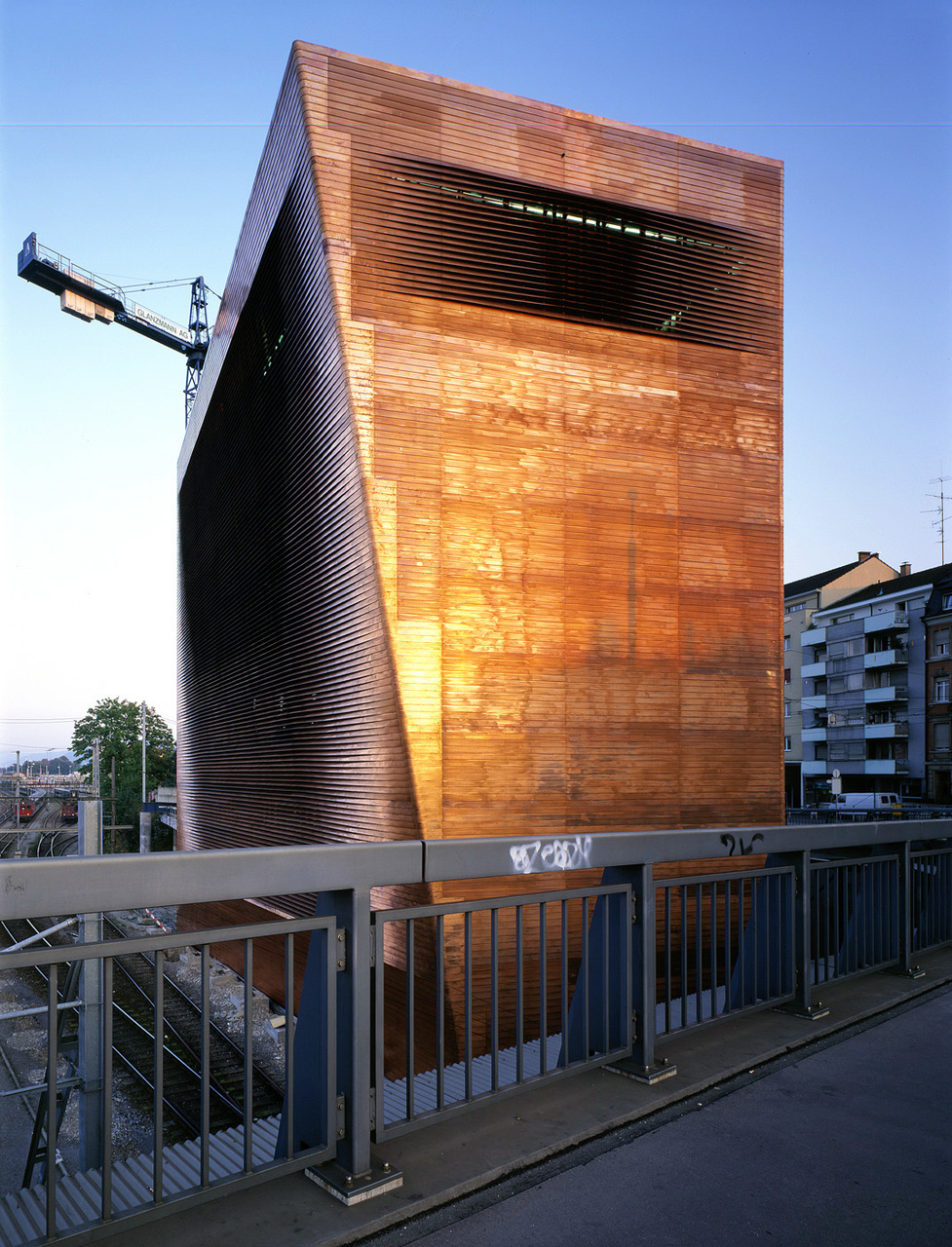 Bereits 1994 realisierten die Architekten einen analogen Bau für die gleiche Bauherrschaft. Mit seiner eigenwilligen Hülle aus Kupferbändern fand er sogleich international Beachtung. Doch dieses erste Stellwerk steht auf einem Geleisefeld, das selbst für Basler nicht immer leicht zu finden ist. Das neue Stellwerk hingegen erhebt sich neben dem Kopf einer stadtnahen Brücke über die Geleise. Die Fassade hat nach Süden drei kleine Fensterbänder, sonst aber ist sie völlig geschlossen und wiederum mit Kupfer verkleidet. Gegenüber dem Vorgänger hat das neue Stellwerk mit seinen 26 Metern markant an Höhe gewonnen. Fast möchte man es als ein kleines Hochhaus bezeichnen. Der Grundriss auf Gleisniveau entspricht einem unregelmässigen Trapez; doch an der Traufkante der flachgedeckten Kubatur ist er zu einem Rechteck geworden. Die Architekten näherten die beiden Grundformen rhythmisch über die Stockwerke einander an, was zu einer leicht konvexen, wellenartigen Fassade im Norden und Westen führte. Der Bau, der ohnehin wie ein exotischer Findling wirkt, hat auf diese Weise einen expressiven Charakter erhalten. Da er sonst nach minimalistischen Regeln erstellt wurde, entstand eine seltene ästhetische Symbiose. - Mit seiner monolithischen Form wird dieses Stellwerk zu einem plastischen Körper mit der Präsenz eines Kunstwerks. An einem Ort mit verwirrender verkehrstechnischer Infrastruktur wirkt diese Architektur beruhigend: Sie lässt eine neue Mitte entstehen. Im Zusammenhang mit diesem Stellwerk muss auch das neue Institut für Spitalpharmazie erwähnt werden, das zur gleichen Zeit wie jenes ebenfalls von Herzog & de Meuron fertiggestellt wurde und eine ähnliche Mischung aus Stadtreparatur und Skulptur darstellt. Der viergeschossige Baukörper ist vollständig mit Glas verkleidet, dem im Siebdruckverfahren flaschengrüne Punkte aufgesetzt wurden.
