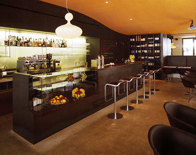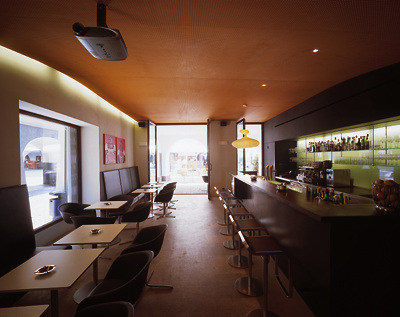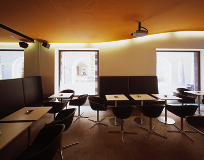 Die curryfarbene gelochte Gipskartondecke setzt zu einer sanften Tuch-Welle an, der Raum darunter ist in dunkle Töne getaucht: Die Wände sind mit schwarzem Schultafellack überzogen, die Innentüren ebenso, die Einbaumöbel wurden aus dunklem Wenge-Holz gefertigt, auch das dunkelbraune Nappaleder der Sitzbänke fügt sich in den homogenen Lokalaugenschein. (Text: Gabriele Kaiser)