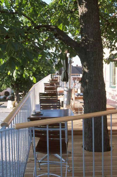 Die Konstruktion spiegelt den dualen Ansatz der zwei Materialien wieder. Die Auframpung aus Stahlbeton verweist auf die Felsengründung der gesamten Altstadt. Die Leichtkonstruktion des Terrassendecks entlehnt die Bauweise aus dem Schiffsbau, und wurde aus Fertigteilen montiert. Das Sitzen auf den Lärchenleisten soll den Besucher auf eine Schiffsfahrt einladen, abgesetzt und bewegt von der harten Stadtstruktur. Die raumgreifenden Elemente der Terrasse sind transparent, doch unter Verzicht auf Glas hergestellt worden. (11.06.2001)