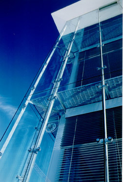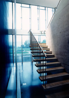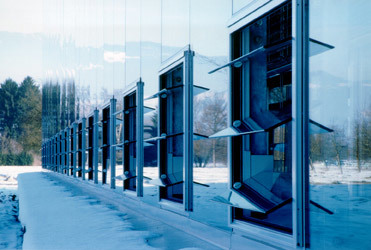 Als böten die rund 900 m² Glasfassadenflächen nicht schon ausreichend Gelegenheit, die Innenräume ausreichend mit Tageslicht zu erfüllen, sorgt eine zusätzliche Lichtlaterne im Obergeschoss für ein erhelltes (und erhellendes) Arbeitsumfeld. Zur Optimierung der Computerarbeitsplätze wurden nicht nur Tageslichtumlenklamellen und Abblendrollos im Fassadenzwischenraum, sondern auch Lichtumlenkrollos im Laternenbereich installiert. Die Luftzufuhr für den raumklimatisch wertvollen Fassadenzwischenraum wird über regelbare Glaslüftungsklappen gesteuert. Im Sommer wird kühle Frischluft in den Zwischenraum geblasen, im Winter verteilen Ventilatoren die auf der Sonnenseite entstandene Warmluft gleichmäßig rund um das Gebäude. (Text: Gabriele Kaiser)