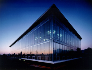 Der streng geometrische Zentralbau der ersten Bauphase (mit den Maßen 40 x 20 Meter) ist von einer doppelhäutigen Ganzglasfassade umhüllt, die große Leichtigkeit ausstrahlt, da sich das Plattenfundament einen Meter über den Boden erhebt. Die Glashypokauste erfüllt tageslichtregulierende und energetische Maßnahmen und fungiert als Puffer zwischen Innen und Außen. Ein monumentales, sechs Meter hohes Eingangsportal definiert das Entree, durch einen mit zwei Zugangskontrollen gesicherten Aluminiumtunnel gelangt man ins Verteilerfoyer, das zweigeschossige Atrium erschließt die jeweiligen Büros.
