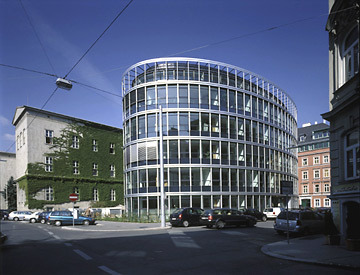 Der Typus einer sockellosen gläsernen Ellipse erwies sich an der Kante dreier Gassen nicht nur in städtebaulicher Hinsicht als „Leistungsform“: Ein ellipitischer Baukörper wirft zudem weniger Schatten als ein flächen- und volumsgleicher rechteckiger Baukörper, was sich im dichtverbauten Gebiet als besonders vorteilhaft erweist. Diese günstige Volumen-Oberflächen-Relation bot auch die Basis für die Ausformulierung eines betriebskostenschonenden Niegrigenergiehauses, und so mag es nicht verwundern, dass die Ellipse noch vor Baubeginn einen Gesamtmieter fand.