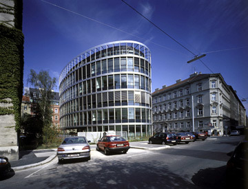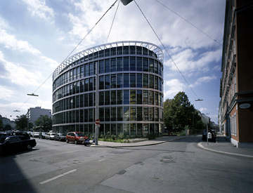 Für die Bauphase selbst hatte dies eine extreme Straffung des Zeitplans auf insgesamt neun Monate zur Folge, die vorgesehene Bauteilkühlung konnte aus Termingründen nicht ausgeführt werden. Die Ellipse besitzt einen dreigliedrigen Betonkern (Treppenhaus, Aufzüge, Nassbereiche), die Fassade als Pfosten-Riegel-Konstruktion mit öffenbaren Fenstern ist rundum transparent. Dass dieser Gebäudetypus keine eindeutige Vorder- oder Rückseite aufweist, sondern mit seinen omnidirektionalen Rundungen wie eine Drehscheibe im Stadtraum steht, kann dem Image der darin ansässigen Firma wohl nur zur Ehre gereichen. (Text: Gabriele Kaiser)