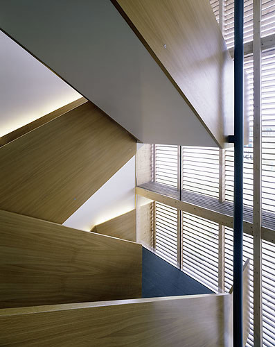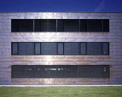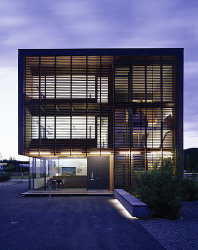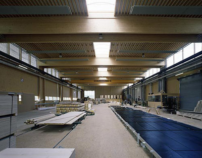 Die einzelnen Baukörper dieses Ensembles verweisen in ihrem differnzierten konstruktiven Ansatz auch auf die Unterschiedlichkeit ihrer Nutzung. Die Abbundhalle wurde als reine Holzkonstruktion mit Holzleimbindern als querliegende Hauptträger ausgeführt, den äußeren Abschluss bildet eine Fassadenbekleidung aus auf Wunsch der Bauherrn beschichteten Dreischichtplatten. Der Bürotrakt (Betontragskelett auf Stahlsäulen mit hochwärmegedämmten Fassadenelementen in Holzfertigteilkonstruktion) verfügt über eine „glitzerde Stirn“ aus Kupferblech. (Text: Gabriele Kaiser)