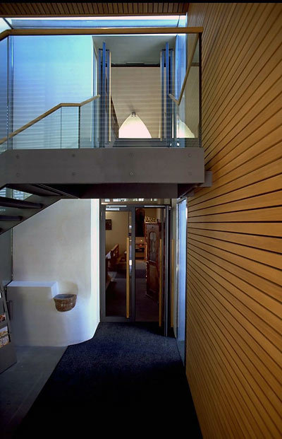 Die Erweiterung an der Nordseite der Kirche, eine reduzierte Struktur aus Sichtbeton, Stahl und Glas, bietet einen witterungsgeschützten Zugang zur kleinen Aufbahrungshalle sowie einen direkten Aufgang zur Empore. Die L-förmige Gesamtanlage umfängt einen ruhigen Platz hinter der Kirche über dem früheren Friedhof, das abgehobene Flugdach auf schlanken Stahlstützen setzt der tektonischen Geschlossenheit der Bestandskirche einen luftigen Kontrast entgegen. (Text: Gabriele Kaiser)