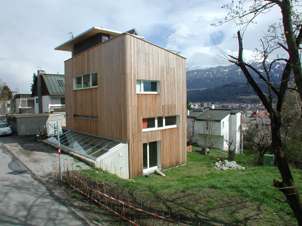 Das am Nordhang von Innsbruck gelegene Grundstück ist mit einem Turm bebaut, der mit seiner kleinen Geschoßfläche ein Maximum an Garten und Grünraum belässt. Die Fassade aus sägerauen Lärchenlatten unterstützt den einfachen und rohen Charakter des Hauses, den der Architekt und gleichzeitig Bauherr angestrebt hat. Auf fünf Ebenen finden sich getrennt die Bereiche für Arbeiten und Wohnen. Der mit einem 25 m² Oberlicht im Norden gleichmäßig erhellte Arbeitsraum liegt unter der Erde, im ersten und zweiten Stock befinden sich die Wohnbereiche. Das Erdgeschoß ist als „Belieferungsraum, Abstellraum und Staubfänger“der Puffer zwischen Arbeit und Wohnen. Eine überdachte Terrasse schließt den Turm ab und bietet ein Maximum an Aussicht auf Stadt, Land und die Bergmassive der Umgebung.Daten: