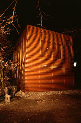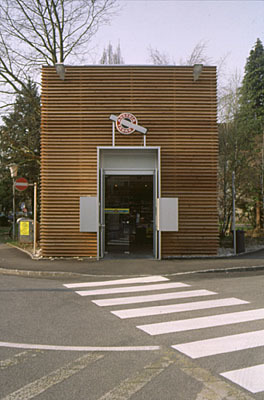 Durch die Wahl des Materials Holz und der strengen Geometrie des Baukörpers bedarf es einerseits keiner formalen Werbeträger, um die notwendige Aufmerksamkeit der Passanten zu erzielen, und andererseits ermöglichte es eine sehr ökonomische Herstellung.