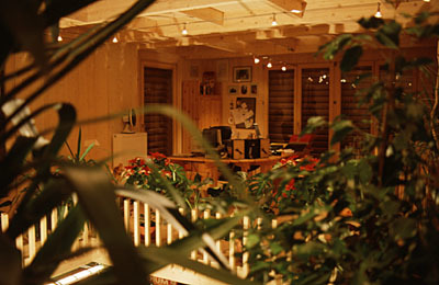 Wie bei allen gewerblichen Nutzungen, fällt auch hier dem Eingangsbereich eine wesentliche sowohl architektonische als auch funktionelle Aufgabe zu. Einerseits ist es von außen das einzige nicht in Holz ausgeführte Element, und andererseits schiebt sich der Kubus aus dem Hauptkubus heraus und macht so auf seine Besonderheit aufmerksam. Die funktionalen Anforderungen waren neben dem Eintreten und Verlassen des Gebäudes: Werbeträger, Vitrine, Zigarettenautomat, Schmutzfänger und Pufferraum zur Anlieferung der Zeitungen, welche in der Nacht angeliefert werden (Doppeltür). Der Schlüssellocheffekt wird noch zusätzlich durch das Lochblech verstärkt. Von innen ist die Öffnung der Türe der einzige direkte Sichtbezug zum Außenraum und daher für die Angestellten von enormer Wichtigkeit. (Hans Peter Müller)