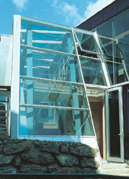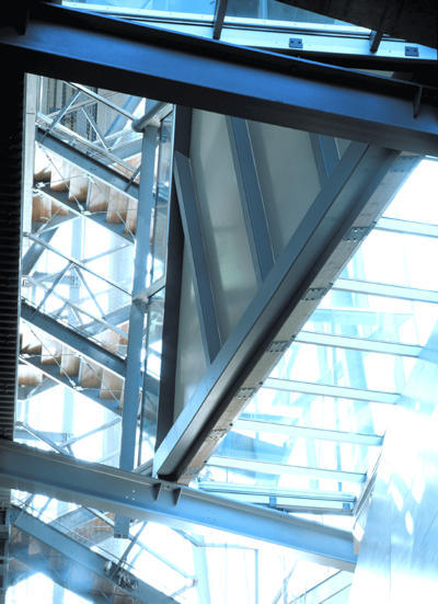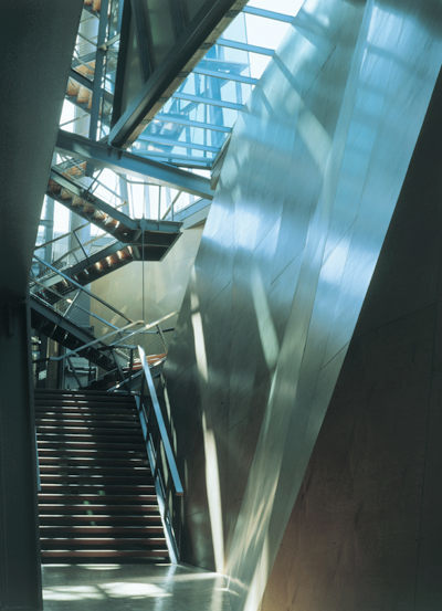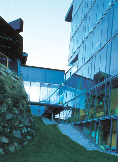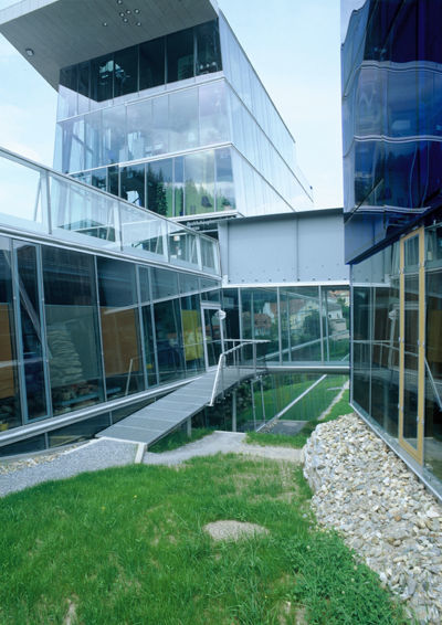 Diese Herangehensweise mutet höchst theoretisch und kopflastig an. Besucht man heute das fertig gestellte Bauwerk, erstaunt sowohl die Schlüssigkeit dieser Methode als auch das durch und durch praxistaugliche Resultat. Das umfangreiche Raumprogramm wurde auf drei Häuser aufgeteilt, die sich um den Mursteg gruppieren und an diesen mittels einer Brücke angebunden sind. Von den sieben Geschoßen des Haupthauses liegen drei unter dem Straßenniveau entlang der Flanken des ausgehobenen Grabens und ankern als abgetreppter Sockelbau fest im Gelände. Vier erheben sich darüber in einem kompakten, kubisch-kristallinen Körper. Schon von der Eingangsebene aus ist das gesamte Volumen des aus einem Beton-Stahl-Skelett konstruierten Gebäudes erfassbar. Denn zwischen Haupttrakt und Gelände schmiegt sich ein 22 Meter hoher verglaster Luftraum, in den die Treppen, Gänge und der Lift in einer Stahlkonstruktion angeordnet sind.