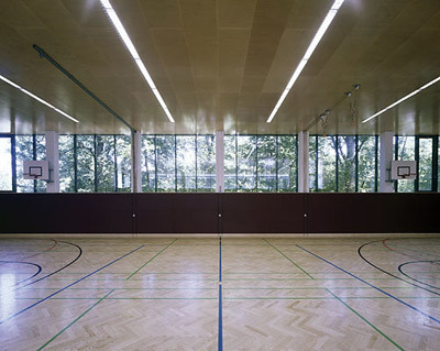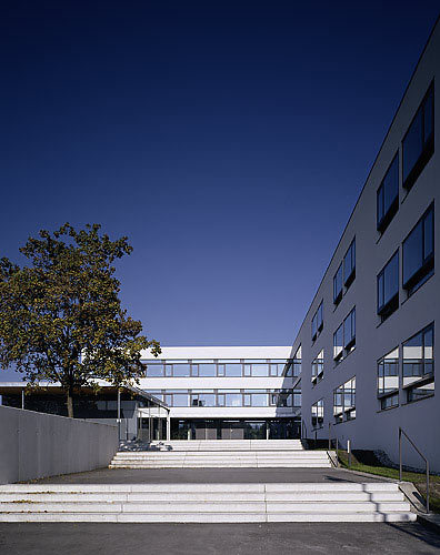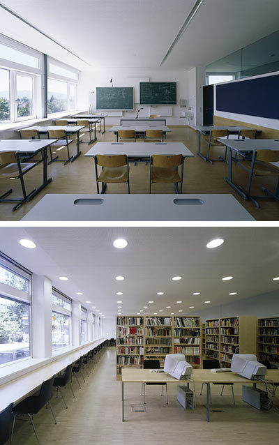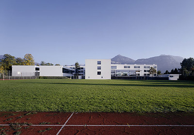 Das in Vorarlberg als „Der Schoren“ bezeichnete Gymnasium weist mit 40 Klassen und ca. 1.050 Schüler:innen ein sehr breites, versuchsfreudiges Spektrum an Schulformen auf. Die weitläufige, 1972 eröffnete Anlage hatte nach 30-jährigem Schulbetrieb eine Generalsanierung nötig, wofür 1998 ein geladener Wettbewerb durchgeführt wurde, den das Büro Dietrich I Untertrifaller für sich entschied.Durch die Generalsanierung konnte nicht nur der Ausstattungsstandard der Schule gehoben, sondern durch Zubau und Aufstockung auch die Raumkapazitäten erhöht werden. Sämtliche Neubaumaßnahmen wurden in Holzelementbauweise ausgeführt, die sich ohne sichtliche Zäsur zwischen Alt und Neu ins ohnehin vielschichtige Gefüge der Schule integrieren. Der neue Mehrzweckaal gibt dem über Treppenkaskaden erreichbaren Haupteingang im Norden eine räumliche Fassung, von der zentralen Pausenhalle strahlen im Windradprinzip die unterschiedlichen Schultrakte aus. (Text: Gabriele Kaiser)