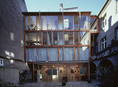 Die Fassade des Erdgeschoßes ist eine reine Nurglaskonstruktion. Die Fassade im 1., 2. und 3. Obergeschoß ist eine vollständige Holz-Glaskonstruktion bestehend aus einer Wärmeschutzverglasung und Massiv-Nußholz-Fenstern, die sich nach außen öffnen. (Beim gesamten Gebäude wurde aus ökologischen und gesundheitlichen Gründen auf synthetische Holzschutzmittel, Lacke usw. verzichtet, um so ein gesundes Wohnen in einem gesunden nachwachsenden Baustoff zu ermöglichen.)