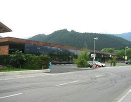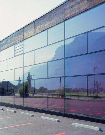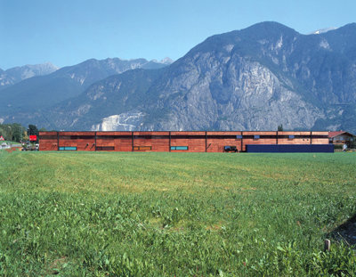 Die Südseite, aus grosser Distanz und mit „unberührter“ Natur im Vordergrund sichtbar, ist weitgehend geschlossen, gegliedert mit grossen Fassadenelementen aus vorpatinierten Dreischichtplatten in Lärche. Nach Norden ist die Halle vollflächig verglast und holt das Panorama der gegenüberliegenden Martinswand suggestiv in den Innenraum herein. Die ausbetonierten Stahlprofile bilden mit den grössenmäßig variierenden Fixverglasungen ein optisch entspanntes Flechtwerk. Der hellgraue Steinboden heizt das Ganze, gespeist durch Erdwärme aus Kollektoren unter dem 1.000 m² großen Parkplatz. Mitarbeiterbereiche und Büros bilden innen an der Südwand eine eingeschobene Galerie, containerartige Lagerbereiche, farbig abgesetzt, bilden dazu ausserhalb ein niederes Pendant. (Text: Otto Kapfinger, 03.01.2003)