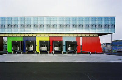 Das Prinzip der Repitition des funktional Notwenigen wird in der Aussenansicht des Logistikzentrums ein wenig verspielter fortgeführt, wiewohl der Glaskörper des Obergeschosses als auch die Sequenz der Lieferportale ganz im Dienst der selbstbewusst ausgestellten Ratio stehen. Bei soviel Strenge in der Binnenstruktur kann man fassadenseitig durchaus ein wenig mit dem Farbfächer spielen - und sich sogar einen kessen Hüftschwung leisten. (Text: Gabriele Kaiser, 05.12.2002)