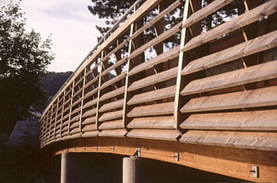 Eine zentrale Rolle im Erscheinungsbild und Architektur der Brücke spielt die leichte Bogenform der Konstruktion. Ästhetische Überlegungen, Lösung der Entwässerungsprobleme, aber auch gewonnenes erhöhtes Abflußprofil im Hochwasserfall führten zur Entscheidung für eine deutliche Überhöhung des Systems; der Stich beträgt zwar nur 40 cm - er trägt aber entscheidend zur Eleganz der Brücke bei. Außerdem steht dies im Einklang mit der leichten Anrampung der Brücke.
