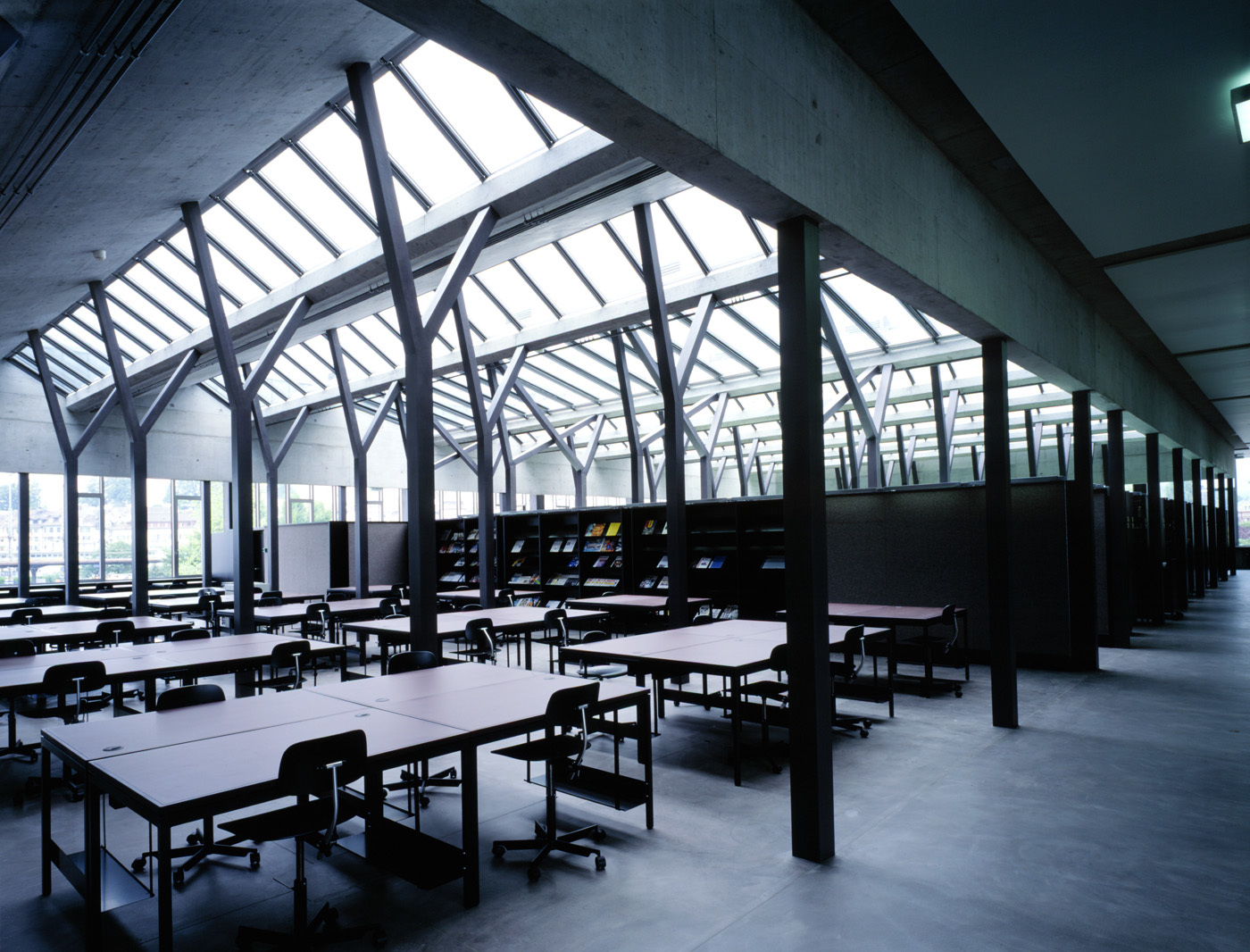 So einheitlich sich die neuen Gebäude von aussen präsentieren, so unterschiedlich ist die Raumeinteilung im Inneren. Sinnfällig steht das Foyergebäude im Mittelpunkt der Gesamtanlage. Während der offene Foyercharakter das Gebäude mit Aufenthaltsräumen und Gängen entlang der Fassade dominiert, verdichten sich die Räume zur Mitte hin. In diesem zentralen Körper befinden sich unten die Hörsäle und darüber die Bibliothek, die mittels Sheddächern belichtet wird. Die Hörsäle haben demzufolge kein Tageslicht; der Konzentration während der Vorlesung im geschlossenen Raum folgt die Pause im vollständig nach aussen sich öffnenden Foyer. Bei der Auswahl von Materialien und Farben wurde auf Einfachheit und Gediegenheit geachtet. Die Stützen sind aus einfachem Schleuderbeton; durch die dunkelgraue Einfärbung und die gerundeten Ecken wirken sie doppelt geadelt. Die einfachen Neonröhren auf den Säulen verleihen dem Raum am Abend den Eindruck einer minimalistischen Inszenierung. Auch der geschliffene Hartbetonboden bekommt durch einen gelblichen Lehmton Terrazzoqualität - bei der Hälfte des Preises. Alle Farben sind dezent grau und schwarz gehalten.