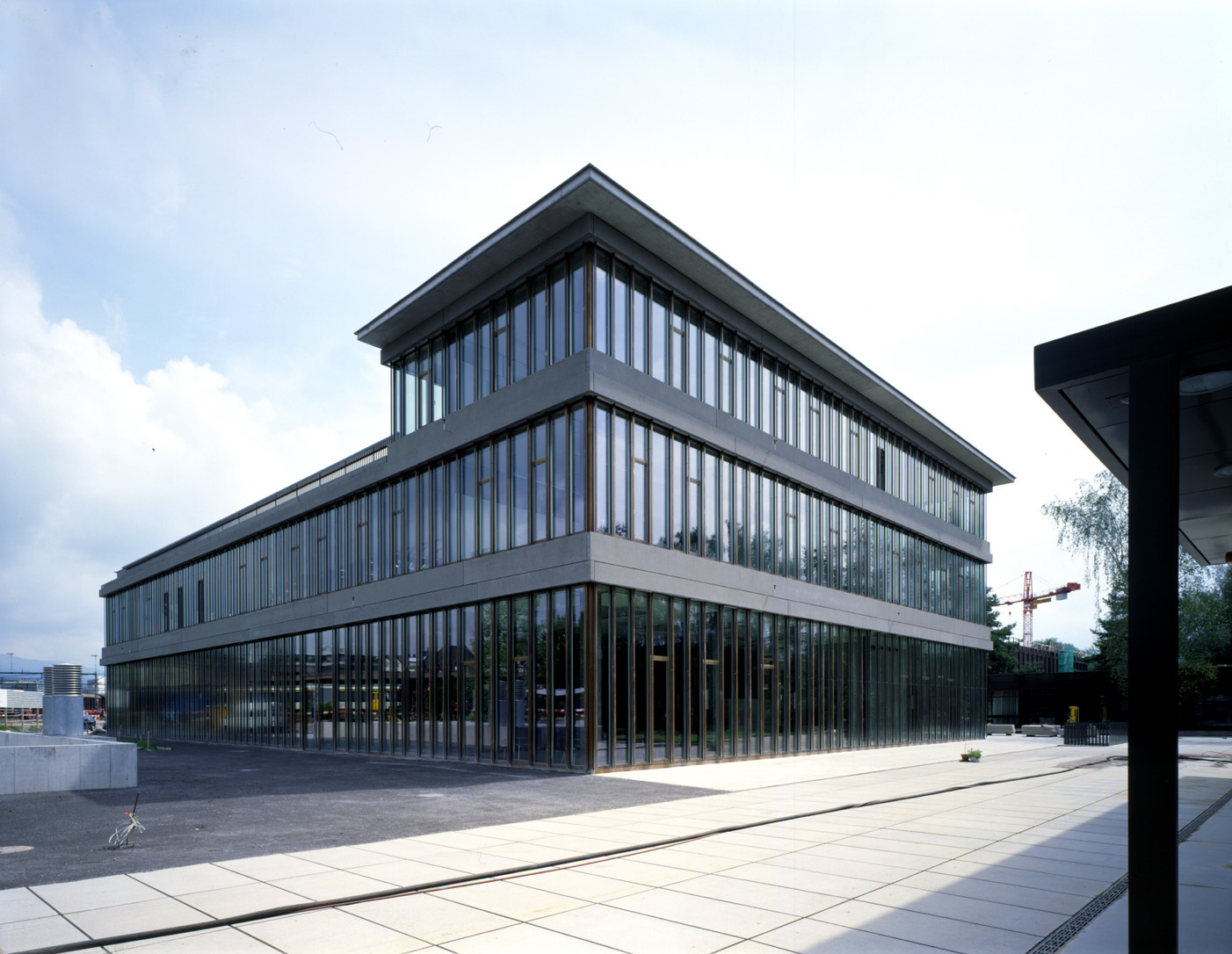 Trotz ganz unterschiedlichen Innenraumaufteilungen sind die Gebäude aussen nahezu identisch. Klassische curtain-wall-Fassaden und vertikale Glasbänder, die von Storen rundum geschlossen werden können, bestimmen das Bild. Nur vor den innenliegenden Stützen wurde auf Storen verzichtet, so bleibt das konstruktive Raster immer sichtbar. Die bronzenen Rahmen nobilitieren das schlichte Gewand. Besonderer Clou sind die vertikalen Glasstreifen zwischen Wand und Storenführungen. Sie dienen nicht nur zur Aussteifung, sondern auch zur Vermeidung der optischen Schwere, die durch die additive Häufung der Storen sonst entstanden wäre. Zudem halten sie die curtain-wall «faltenfrei». Einzige horizontale Zäsuren sind die vorgezogenen Dachüberstände sowie Brüstungs- und Geschossdeckenbänder.