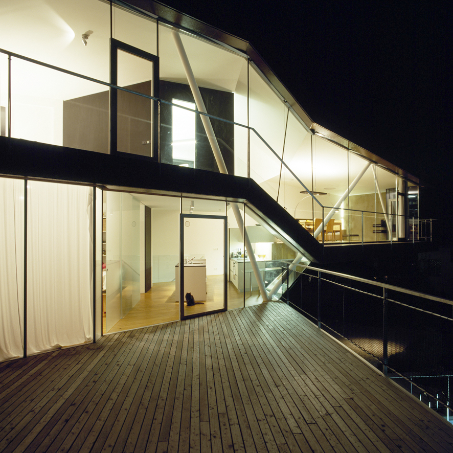 Vom kommunikativ freistehenden Bar-Spül-Block mit Granitplatte ist das transparente Kindereck zu übersehen, Mattglasschiebeelemente halten Spielzeug in Grenzen. Ein multifunktionales Raummöbel wächst als stauraumbergendes Sitzpodest aufs Wohnplateau, in der Küche weitet es sich zum Herd. Durch einen Glaskörper in der Arbeitsplatte folgt man dem Verlauf der V-Stütze, die in die Terrasse mündet. Vom „werkraum“, sehr zart dimensioniert, gibt sie der südlichen Nurglasfront zusätzlich Dynamik, mit einer Zugstrebe trägt sie den ganzen Baukörper. Er kragt 13,5 Meter weit aus und schafft so einen gedeckten Freiraum im Garten. Möbel, Raum, innen und außen werden zum Ganzen.