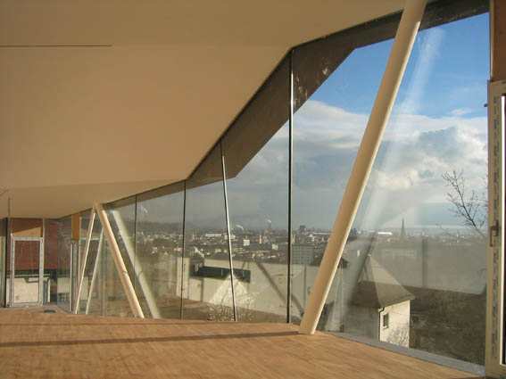 Der Pöstlingberg ist Linzer Top- Lage, Grund rar und sehr teuer, dem Haus blieb low-budget. Der unregelmäßig trapezförmige 800 nach Süden sechs Meter ab. An drei Seiten umgibt ihn der Dannerweg, wo die Bauordnung fünf Meter Abstand vorschrieb. Im Visier der Nachbarn war keine Privatheit, ihnen zeigt die gebaute obere Raumschleife den braunen, mit elastischer Polyurethan-Folie überzogenen, von zwei Fensterbändern geschlitzten Rücken, aus dem halbkugelförmig Oberlichter ragen. Überm Garten öffnet sie sich mit schwebender, vollverglaster Südfront zum Linzpanorama.