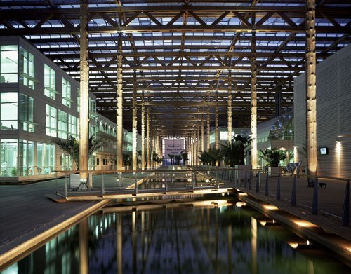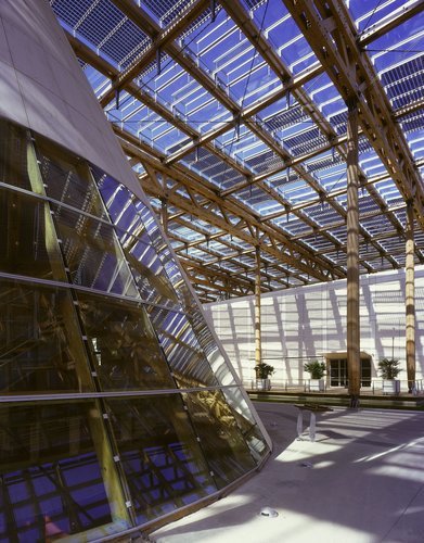 Die gläserne Hülle übernimmt eine weitere Funktion: In das Dach und die Südwestfassade wurden mehr als 10 000 Quadratmeter Photovoltaik-Module integriert. Stolz spricht denn auch die «Entwicklungsgesellschaft Mont-Cenis» vom grössten Solarkraftwerk der Welt. Die glasintegrierten Siliziumzellen, die zusammen eine Spitzenleistung von einem Megawatt erbringen können, sind hier einmal nicht lästige Applikation, sondern dienen, gleichsam zu Wolken arrangiert, der gezielten Verschattung einiger Raumpartien im Inneren. Mit grossen Dächern und gläsernen Hüllen haben Jourda & Perraudin schon verschiedentlich experimentiert - so beim Internationalen Schulzentrum in Lyon (1989-92) und den Universitätsbauten für Marne-la-Vallé (1992-96). Wurde die Stringenz ihrer Projekte aber bisweilen durch manieriert-organische Ausbildungen in Frage gestellt, so beeindruckt das Meisterwerk in Herne gerade durch seine strukturelle Klarheit und formale Prägnanz. Zudem ist es ein Beleg dafür, dass ökologisches Bauen und grosse Architektur zu harmonieren vermögen.