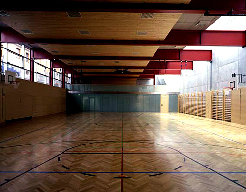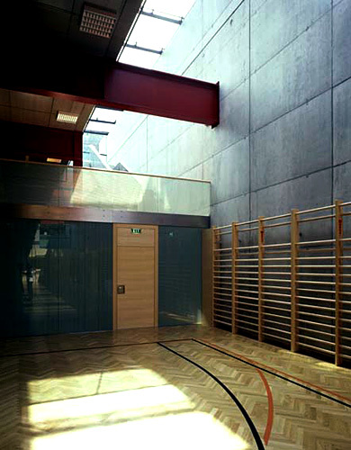 Hauptansatz des Entwurfes war es, einerseits dem Außenbereich eine ruhige klare Gliederung zu geben, andererseits im Inneren unter Erfüllung aller funktionellen Forderungen ein großzügiges Raumkontinuum vom Erdgeschoss der bestehenden Schule bis in die Turnhalle zu schaffen. Die Materialwahl bei der Innengestaltung unterstützt das Anliegen eines hellen unbeschwerten Raumeindruckes.