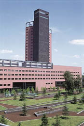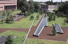 Unter dem brückenartig aufgeständerten Gebäudetrakt beim monumentalen Bürohauseingang befindet sich auch der zentrale Parkeingang. Eine holzgedeckte Brücke, architektonisch aufgefaltet, spannt den Bogen vom schattigen Vorplatz zum sonnigen Stadtgarten. Sie überquert ein grosses, an das Gebäude grenzendes Plateau, das mit schweren, bruchrauhen Schieferplatten verkleidet ist. Nach den Plänen der Architekten sollte hier ein grosses Wasserbecken den Bau mit seinen beiden über 80 Meter hohen Türmen spiegeln. West 8 setzte aber mit einer kargen Felslandschaft, gegliedert durch lineare Bruchkanten, ein Gegengewicht zur Architektur. Ein lichter Hain aus Magnolien, besonders sein weisser Frühlingsflor, nimmt dem schwarzen Plateau die Schwere. Das surreale Environment wird durch einen gerichteten Schwarm grünspanfarbener Stellagen ergänzt; ein «Kunst am Bau»-Projekt des niederländischen Künstlers Niek Kemps, das auf Drängen des Bauherrn appliziert wurde.