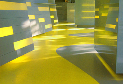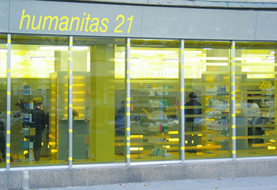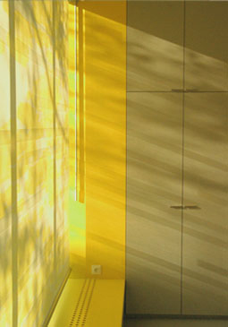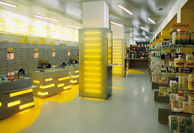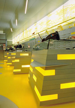 Die Linearität des Raums wird durch horizontale Bänderung motivisch verstärkt: Die Oberflächen der Verkaufspulte sind in Eternitstreifen und hinterleuchteten Elementen aus Plexiglas aufgelöst, ein horizontaler Raster aus Folien liegt wie als semi-transparenter Filter über der Fassade, während an der Rückwand eine 20 Meter Durchlichtplane mit gelben Wolkenmustern Akzente setzt, und auch auf dem Boden des Offizinbereiches wogt das Gelb irregulär. Die Netzrollos sind ebenfalls mit Wolkenmotiven bedruckt, die (nicht immer sonnengelbe) Umwelt zeichnet sich schemenhaft dahinter ab. (Text: Gabriele Kaiser)