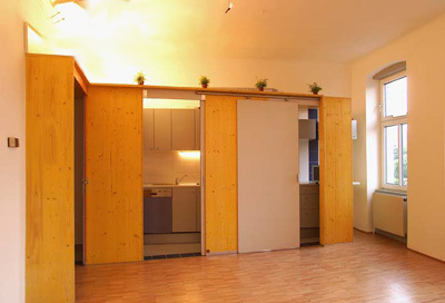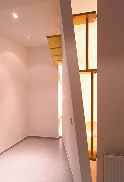 Eine hyperpolisch-parapolide Wand, die das Schlafimmer atmosphärisch nach oben weitet, schwingt ins Foyer aus und definiert hier einen nicht eindeutig definierten Nischenraum, der z.B. als Computerarbeitsplatz genutzt werden kann. Ursprünglich hatte der Architekt einen hofseitigen dreigeschossigen Zubau geplant, dessen Fassade zur optimalen Raumwertschöpfung parallel zur Grundgrenze verlaufen wäre. Spuren dieses bereits genehmigten, doch aus Kostengründen verworfenen Plans sind in den Bodenbelag der Wohnung eingeschrieben. Eine blaue, orthogonal zur Grundgrenze verlaufende Fliesenzeile verweist auf die Achsenverschiebung des überlagerten Grundrisses, die sich aus der Stellung des Zubaus logisch ergeben hatte. (Text: Gabriele Kaiser)