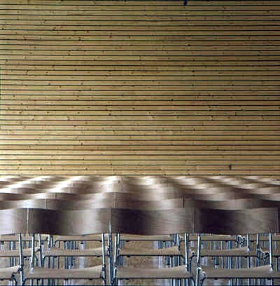 Eine gemeinsam zu nutzende Kantine im zentralen Foyer des Erdgeschosses bildet die Nahtstelle zwischen beiden Funktionen. Als Konsequenz der Einbindung eines Kultur- und Mehrzwecksaales in die Sportanlage wurde auch der Vorplatz und Zugang neu gestaltet. Abschirmende Elemente - wie bei Fußballplätzen üblich - sind eliminiert. Die kommunale Mehrzweckeinrichtung wird zu einem neuen Zentrum des umliegenden Siedlungsgebietes. (Text: Architekt)