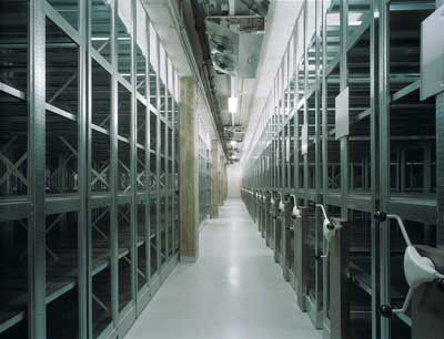 Das Innere besteht aus Rollregalen, die im unteren der zwei Geschosse um einen Tiefkühlraum herumgleiten, wo hoch empfindliches Negativmaterial gelagert wird. Alle technischen Geräte, wegen des intelligenten Energiekonzepts sind es erstaunlich wenige, wurden aufs Dach, Stiegen und Aufzug an die Außenseite der Box gepackt um mögliche Brandherde aus dem Lager fern zu halten.