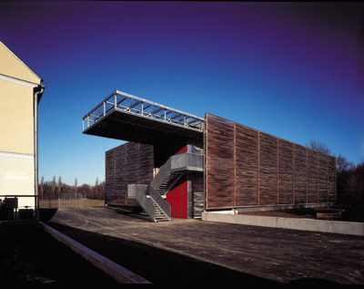 Sein Entwurf für das Kühllagerhaus ist von einer hemdsärmligen Pragmatik, die nur auf manchen Fotos so aussieht, als wäre es eine schmucke Designerkiste. Die schlichte Box aus Lecabeton mit Thermohaut wurde zusätzlich mit Kupferbändern in Filmstreifenbreite eingewickelt, die Schatten spenden und dem Bau von weitem das Aussehen einer recht leger aus Holzlatten zusammengenagelten Scheune geben. Wer unbedingt möchte, kann darin eine österreichische Antwort auf die akkurat mit Kupfer umwickelten Fassaden gewisser Schweizer Eisenbahnstellwerke sehen, aber auch da sind die Bilder trügerisch. Vor Ort zeigt sich der Bau sehr filigran, selbstbewusst und keine Spur epigonenhaft.
