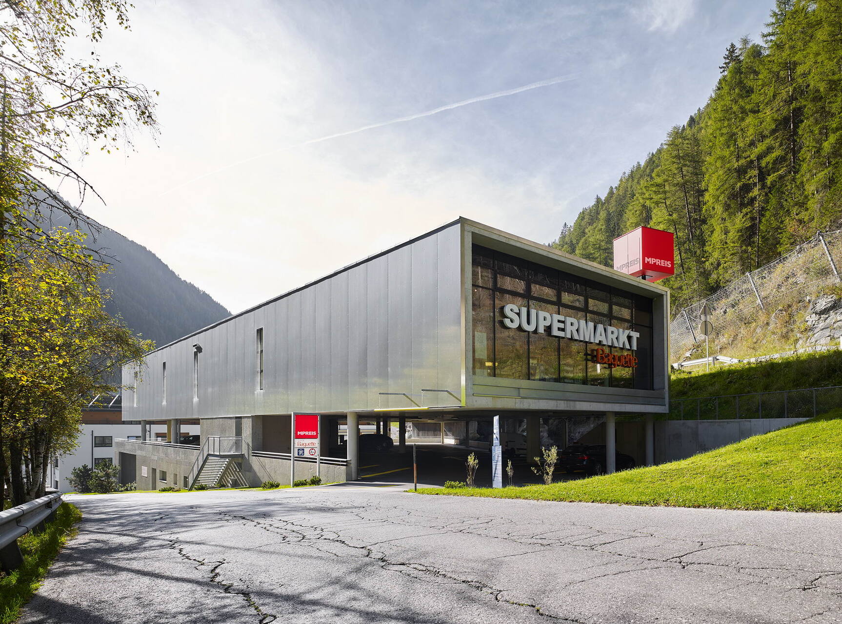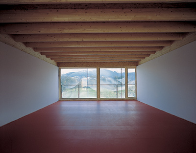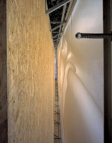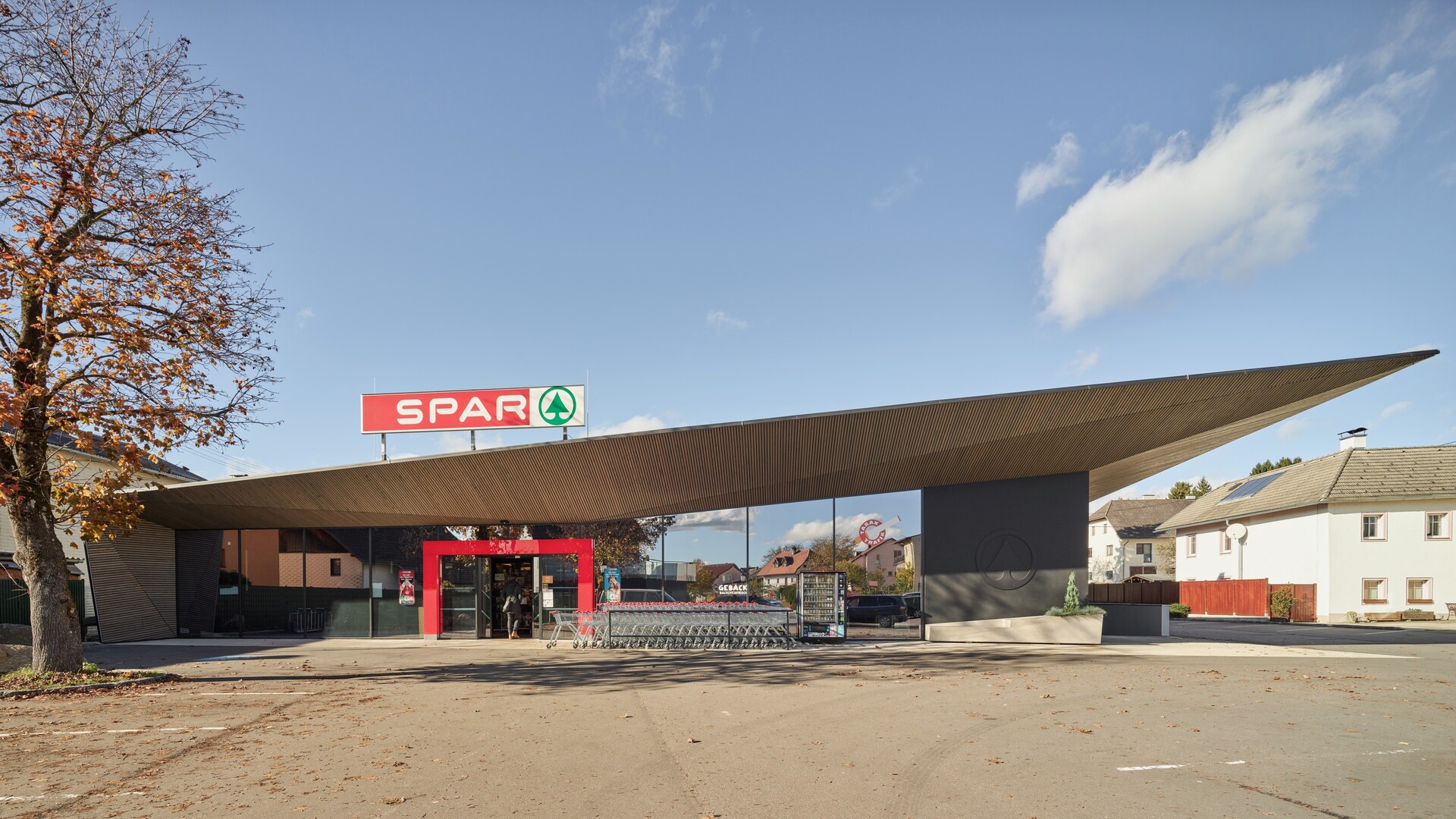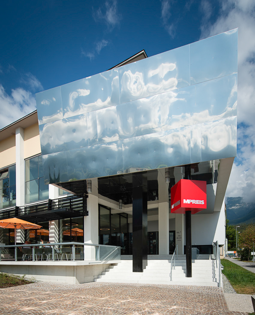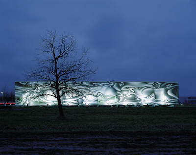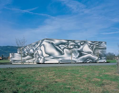 Über die ökonomische Holzkonstruktion aus großformatigen Hohlkastenelementen und schlanken Balkendecken wurde eine Gewebehaut mit einem abstrakten Bildmotiv gezogen, das deutlich die künstlerische Handschrift von Peter Kogler trägt. Auch hier funktioniert die Trennung zwischen Gebäudenutzung und Totalornament wie immer perfekt, indem die Verpackung die schlichte architektonische Form negiert/nobilitiert. (Text: Gabriele Kaiser)