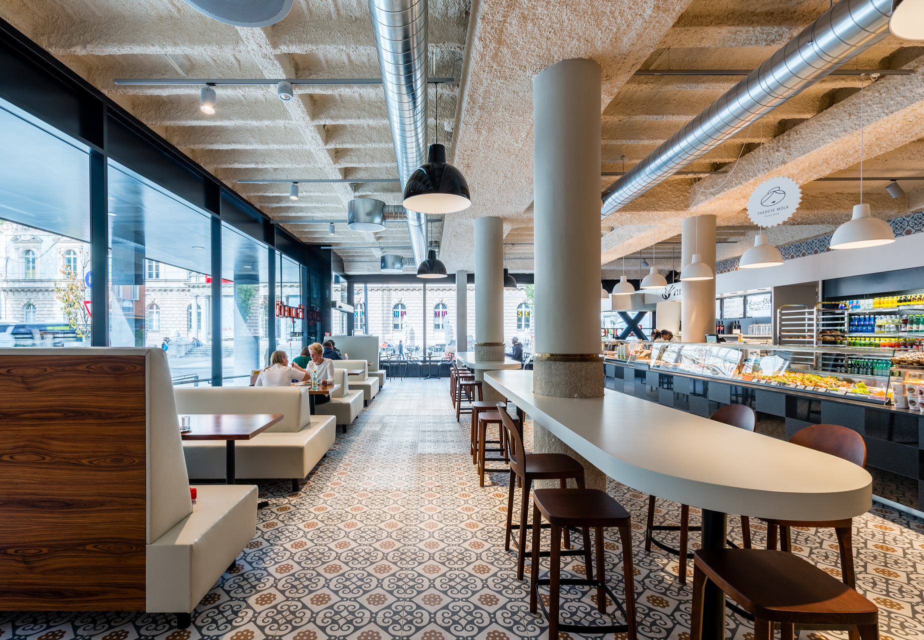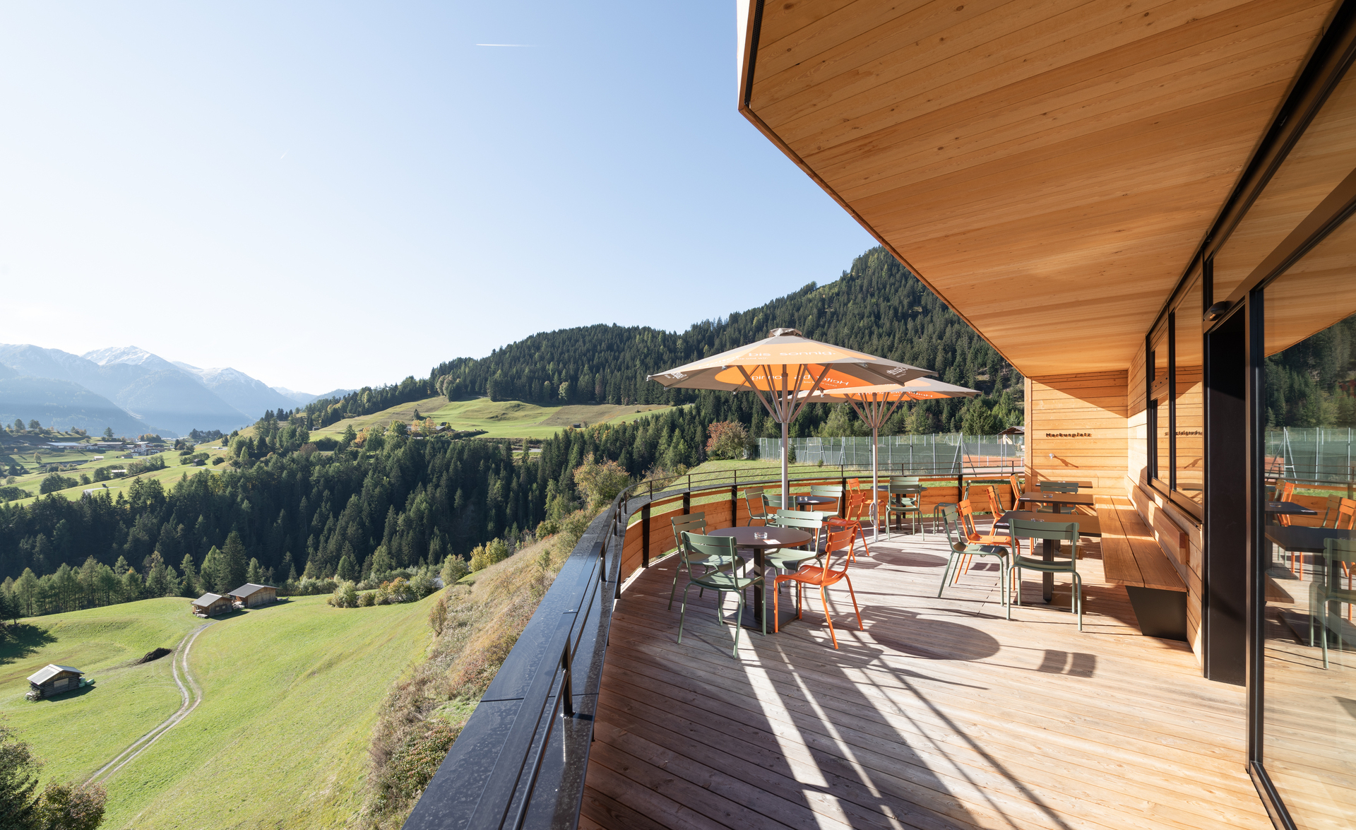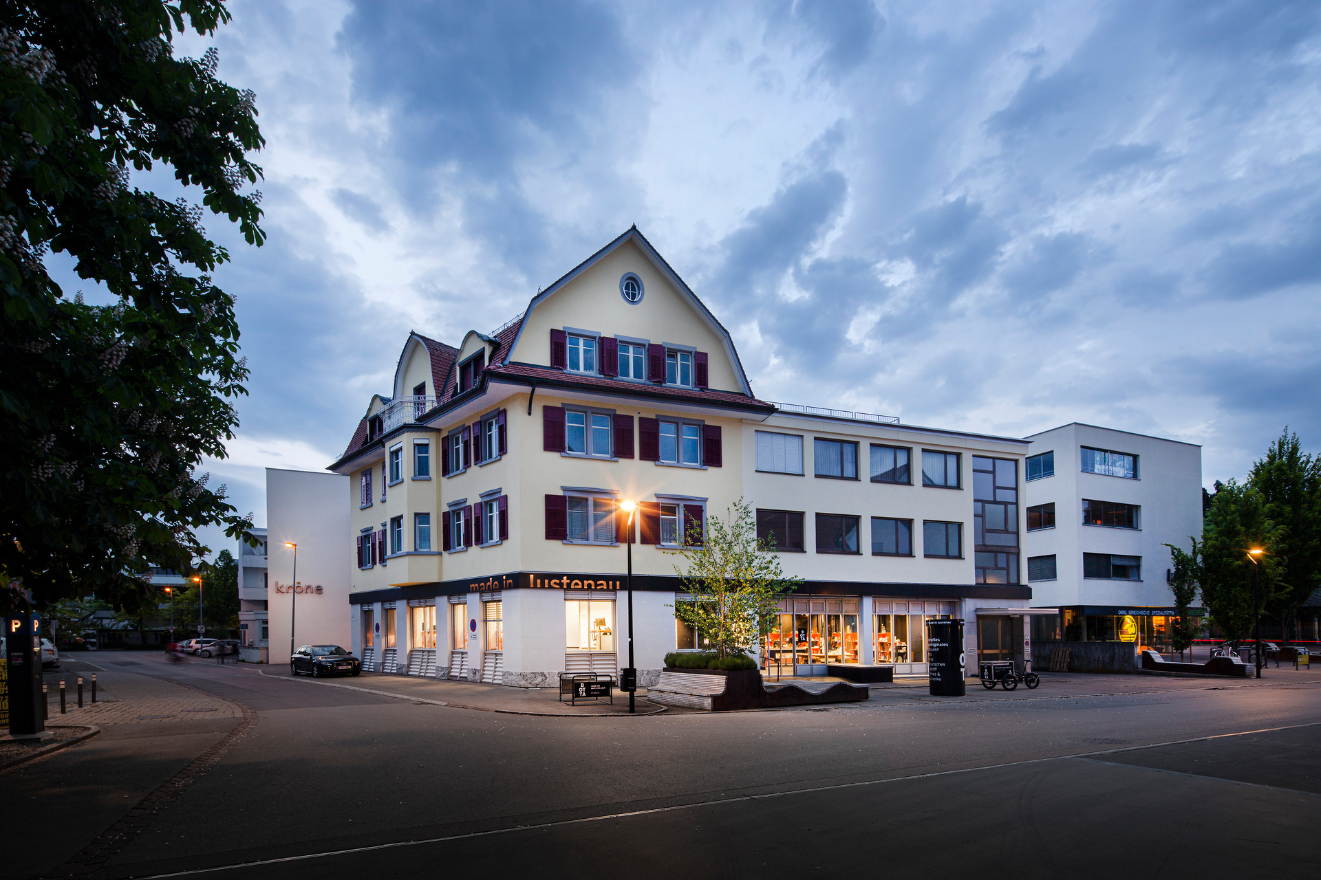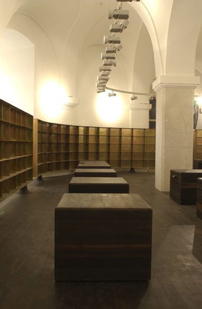 Über die ökonomische Holzkonstruktion aus großformatigen Hohlkastenelementen und schlanken Balkendecken wurde eine Gewebehaut mit einem abstrakten Bildmotiv gezogen, das deutlich die künstlerische Handschrift von Peter Kogler trägt. Auch hier funktioniert die Trennung zwischen Gebäudenutzung und Totalornament wie immer perfekt, indem die Verpackung die schlichte architektonische Form negiert/nobilitiert. (Text: Gabriele Kaiser)