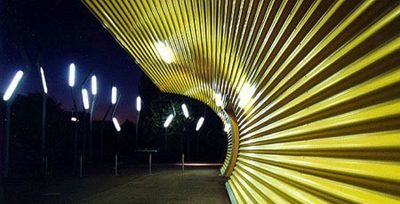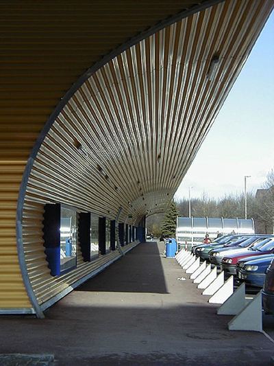 Vor die vorhandene Waschbetonfassade wurden gebogene Stahlträger gestellt, die als Unterkonstruktion für die Wellblechfassade dienen. Die Belüftungs- und Belichtungsfunktion der alten Fassade bleibt erhalten. Mit der Hilfe von Schaukästen und den unregelmässig angeordneten Leuchten wird die gesamte Fassade neu strukturiert.