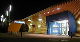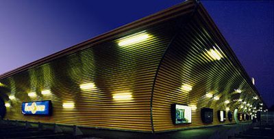 Die fast 150 m lange Fassade erregt Aufmerksamkeit, Beifall und Kopfschütteln. Sie wurde zum unverwechselbaren Kennzeichen des Euro-Centers. Durch die intensive gelbe Farbgestaltung wird diese Signalwirkung zusätzlich verstärkt. (23.07.2001)