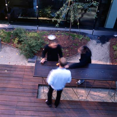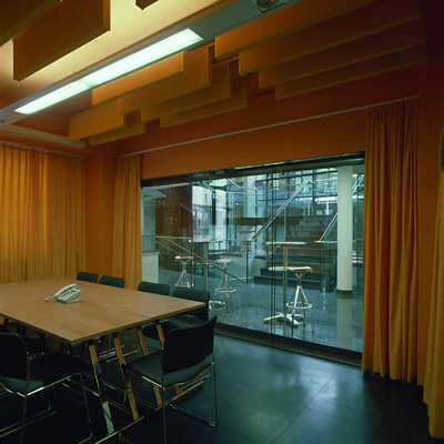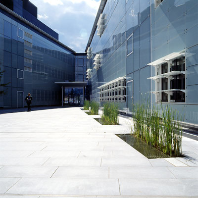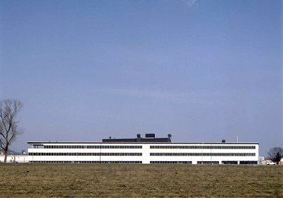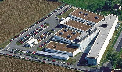 Im spitzen Winkel der sich V-förmig nach Norden öffnenden Anlage liegt in einer inszenatorischen Engführung die Erschließung, in den dreigeschossigen Schenkeln des V befinden sich die Büros und Labors für Forschung und Entwicklung. Eine über alle Geschosse greifende Erschließungshalle weitet sich in den Obergeschossen zu einem verglasten Innenhof. Die Architektur strahlt eine kühle Rationalität aus, die der Struktur eines naturwissenschaftlichen Forschungsunternehmens entspricht, das sich auf eine hohe baukulturelle Tradition berufen kann. Besonders in der Konzeption der äußeren Gebäudehaut (Aluminiublechpaneele bzw. transluzente Glaspaneele, die ihren Variantenreichtum aus einem einzigen Format beziehen) kommt diese Rationalität reizvoll zum Ausdruck. In den kammartigen Trakten an der Ostseite des Gefüges sind die Bereiche Produktion und Lager angeschlossen, in den Höfen dazwischen wuchern die Schaugärten in verführerisch diziplinierter Geometrie. (Text: Gabriele Kaiser)