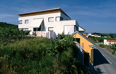 Das Vorhaben zeichnet sich durch das Spannungverhältnis von Alt und Neu aus: An das historische Preßhaus an der Langenloiser Straße wird der erhöht auf der Weingartenterrasse liegende, zweigeschossige Neubau angefügt.