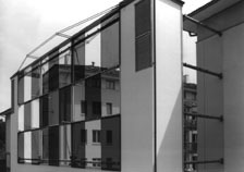 Die Lärmschutzwand ist raffiniert in die Zu- und Abluftbauwerke der Lüftungsanlage der angrenzenden Tiefgarage integriert. Der Farbglasparavent ist zwischen zwei gemauerte Türme mit quadratischem Grundriß eingespannt, welche oben zur Bahn hin die Abluftgitter aufnehmen. Der gemauerte Sockel der Wand, der zur Gasse hin mehrere Stufen ausbildet und damit die Möglichkeit zum Sitzen und Kommunizieren bietet, beinhaltet auf der Rückseite zur Bahn hin die Ansauggitter der Zuluft.