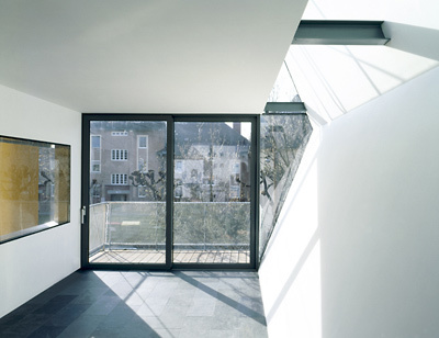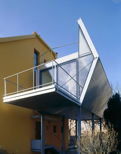 Abstrakt verfremdet nimmt der Bauköper den ortsprägenden Haustyp auf. Seine Urform wurde wie eine Schachtel aufgeklappt, sodass sich das �Satteldach� zur Sonne öffnet. Es wirkt wie eine Parabolantenne als Lichtfänger, der Sonnenstrahlen über eine Glasfläche am Dach in den Raum lenkt. Von oben uneinsehbar, fallen sie durch den Luftraum zwischen den Stahlskelettträgern ins Innere, wo sie die schräge untere Wandfläche nach oben reflektiert. Eine Neonröhre an der Deckenkante setzt das Lichtspiel nachts fort. In Ost undWest öffnet sich die Zubaufaltung mit raumhohem Glas und Schiebetür zu zwei Balkonen, zarteMetallsteher mit rudimentären Netzen bilden das Geländer, man blickt durchs Blätterdach der schönen Magnolie an der Straße über die Siedlung. Am Dach hat die Tante auf einer Ebene mit ihrer Wohnung eine Terrasse mit weitem Linzpanorama.