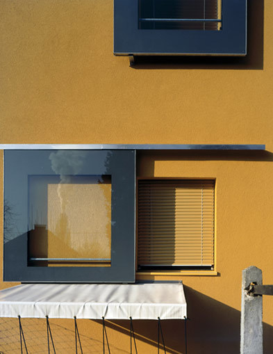Die Bauherren schlafen gartenseitig im Osten bei offenem Fenster, wollten Frischluft und gleichzeitig Schallschutz vorm Autolärm. Dafür entwickelten die xarchitekten einen intelligenten, ästhetischen Prototyp. Das neue Schallschutzglas sitzt ca. 5 cm vor der Fassade, was Luftzug gewährt. Ein breites, die unteren Frequenzen filterndes Schallschutzschaumstoffband rahmt die Fensteröffnung dahinter. So dringen Motorengeräusche nicht ein, man hört nur noch Vogelgezwitscher. Die verschiebbaren Glasquadrate laufen an einer Aluschiene. Subtil variiert sie das nachbarliche Fensterfaschenthema, der Kellerzugang drunter hat ein neues, zartes Blechdach.