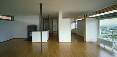 Zur Straße hin ist das Wohngeschoß hermetisch abgeschlossen, die Eingangstür im Kellergeschoß aber als offene Geste verglast. Im Inneren blieben die Betonoberflächen der Roste zwischen den Wandscheiben und den Oberlichten sowie teilweise auch die der Decken sichtbar. Wohldosiert ist die Transparenz der Gebäudehülle. Während der große Wohnraum, der fast die Hälfte des Geschosses einnimmt, jeweils über Eck großzügig verglast ist, verfügen die beiden Zimmer nur über schmale Fenstertüren. Über die Decken streicht durch die Oberlichten tief in die Räume einfallendes Tageslicht. Da dieses Geschoß ausschließlich Wohnzwecken dient kann durch das Lichtband und die wandhohen Fenster stets der Stand der Sonne miterlebt werden.