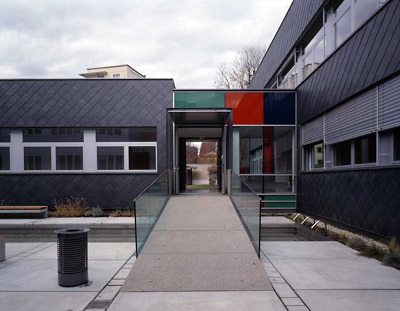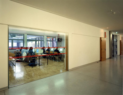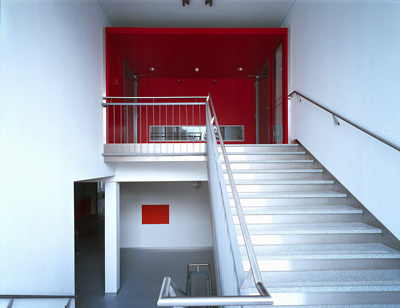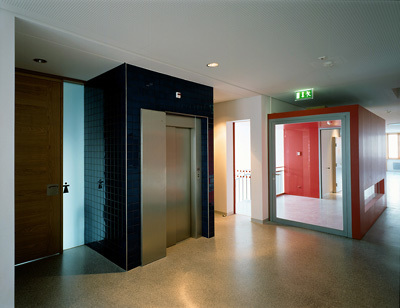 Farbliche Akzente rhythmisieren die Raumgruppen, wobei generell die „Vermehrung“ des Tageslichts ein zentrales Thema war. Es wurden Gangenden aufgebrochen, Verbindungswände abgerissen, Parapete abgesenkt, Geschossdeckenverkleidungen abgenommen, Lichtbänder und Lichtkuppeln eingefügt, neue Sichtbeziehungen zwischen einzelne Baugliedern geschaffen, die Verbindung zum Außenraum verstärkt und generell der syntaktische Aufbau der Schule geklärt. Es zieht ein frischer Wind durch die Gänge: Klassentrakte, Gangbereiche und Verbindungsbauteile sind in Werkstoff und Farbe differenziert, wobei die Materialwahl (Alucobond, Schiefer, Glas, Eichenholz, Terrazzo und Linoleum) auf Basis guter Alterungsfähigkeit erfolgte. Was wohltuend ins Auge fällt, soll ja auch lange halten. (Text: Gabriele Kaiser)