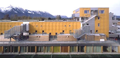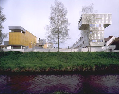 Dieses Zeilenbauwerk mit seiner komplexen Kopfstirnausbildung soll das bekannte Image eines Wohnbaus verlassen und auch von außen ein klares Zeichen setzen. Eine Membran überzieht die Fassade und umhüllt den Bau.Versunkene intime Gärten mit speziellen Einfriedungen und einer künstlichen Landschaft wurden geplant, jedoch vom Bauherrn nicht ausgeführt. Die Ausführung erfolgte bedauerlicherweise durch Dritte und den Bauherrn ausserhalb des Einflussbereiches der Entwurfsarchitekten. Das wird im wesentlichen im Erdgeschoss, im Landschaftsgarten, den Brüstungen und in den Freitreppen sichtbar.