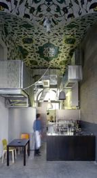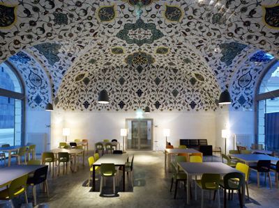 Bei der Gestaltung der Cafeteria wurde dem bestehenden Raum mit einer minimalen Intervention eine neue, einer lebendigen Gastronomie entsprechende, Identität verliehen. In die Ziegelgewölbedecke des Altbaus wurde eine Fliesendecke „gehängt“. Das Muster wurde in Zusammenarbeit mit den Architekten von der türkischen Künstlerin Asiye Kolbai-Kafalier speziell für diesen Raum konzipiert. Das Mosaik an der sechs Meter hohen Decke ist mit seinem orientalischen Muster mehr als nur eine Oberfläche. Mit diesem ornamentalen, lichten Himmel erfährt der großzügige Raum eine komplette Verwandlung, gleichzeitig bildet die Decke ein feingliedriges Gegenstück zu den großen Baukörpern des Quartiers.