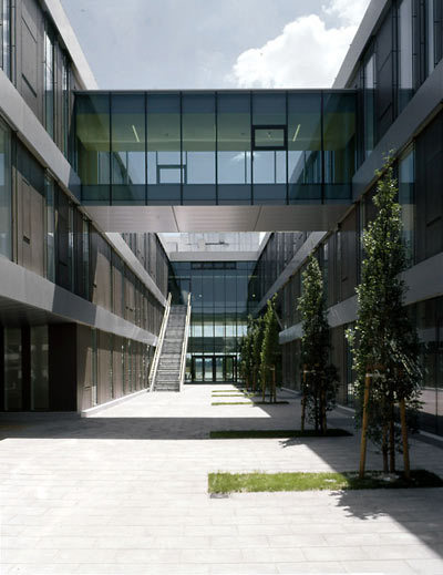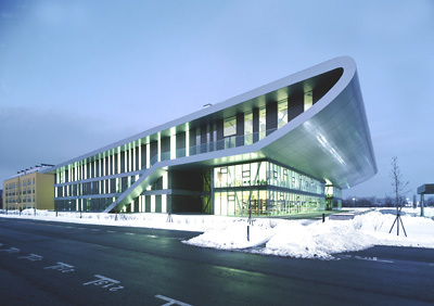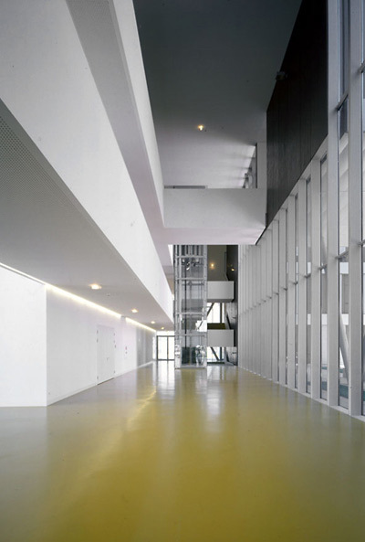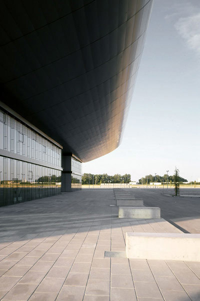 Die Fachhochschule der Architekten Peter und Gabriele Riepl, kurz Riepl.Riepl, in Eisenstadt wirkt auf den ersten Blick sehr niederländisch. Wie bei dem Hörsaalgebäude „Educatorium“ von Rem Koolhaas in Utrecht zieht sich der Boden schräg in die Höhe und schlägt eine Rolle rückwärts und wird zur Geschoßdecke. Während aber Meister Rem das ganze recht beziehungslos in den Raum stellt, orientieren sich Riepl.Riepl am streifenförmigen Bebauungsmuster einer recht banalen Gewerbezonenumgebung. Vorn an der Ausfallstraße macht sich ein Möbelhändler breit, dahinter reihen sich silbrig glänzende Forschungsgebäude wie Lastwagenanhänger, die jederzeit abgeholt werden könnten. Die vorläufig letzte bebaute Parkbox besetzt die Fachhochschule. Sie ist das einzige Gebäude in der Umgebung, bei dem Anfang und Ende definiert sind. Aus dem runden Kopf ergibt sich das Vordach über dem Eingang, an den im Innern eine quer liegende Halle anschließt. Die fünf Hörsäle sind in der Rundung untergebracht, Seminar- und Büroräume ziehen sich in drei Fingern in die Tiefe des Grundstücks. Mit den Außenkanten akzeptiert der Bau stur die Grundstücksgrenzen, im Inneren aber wird die erdrückende Gebäudemasse durch die parallelen Finger geschickt in Höfe gegliedert. Am hinteren Ende ist die extravagante Schlaufe wieder auf der Höhe des Nachbarn angekommen und bindet so die FH mit einem schlichten Studentenwohnheim zusammen.