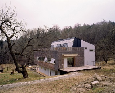 Fensterbänder, geschoßhohe Schiebeelemente und eine über den gesamten Zubau reichende Terrasse inszenieren die landschaftliche Umgebung als Bestandteil des Innenraumes. Ähnlich wie in Krieglach hat hier die Hauptfront ein tiefliegendes Bandfenster mit integrierter Arbeitsplatte und wird die Innenwand durch einen Lichtschlitz beim Anschluss der Decke von oben aufgehellt und belichtet. (Text: Otto Kapfinger, 12.11.2001)