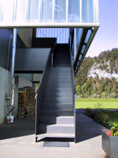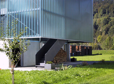 Der linear organisierten Wohnung ist auf die gesamte Länge eine großzügige Terrasse vorgelagert. Die Wohnung ist zur Aulandschaft und zum Landschaftsraum geöffnet und orientiert, sowie Richtung Gewerbegebiet abgeschottet. Die beiden Nutzungen Wohnen und Werkstatt wurden in einem solitären Baukörper vereint. Eine transluzente Haut aus freitragendem Profilglas überzieht den gesamten Baukörper und stellt das verbindende Element der unterschiedlichen Bereiche dar. Durch diese Haut schimmert die als Holzbox ausgeführte Wohnung, die körperhaft wirkende Außentreppe der Wohnung, die südseitigen Sonnenkollektoren, das umlaufende Oberlicht der Werkstatt und deren Stahlkonstruktion durch. (Text: Architekt)