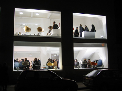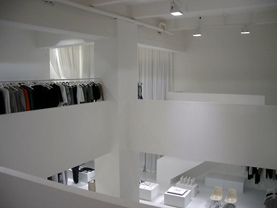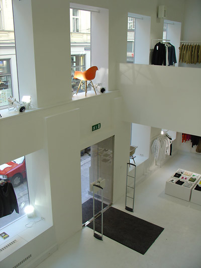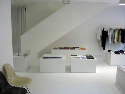 Die Architekten des Shops bringen ihr Anliegen mit einem Satz auf den Punkt: Neutrales Weiß bildet den Hintergrund für das Wesentliche. Ein auf zwei Ebenen geführter weitläufiger Verkaufsraum (rund 480 m²) überlässt somit in nobler Zurückhaltung die Show stets dem „Anderen“: den Kleidungsstücken, den ebenfalls käuflich erwerbbaren und sorgfältig ausgewählten Eames- Möbel-Klassikern, den arrangierten Accessoires. Die Präsentationselemente sind beweglich, der Raum somit dem engagierten Geschäftskonzept entsprechend in hohem Maße nutzungsneutral. Auf Pulten liegen Lookbooks, Kunstbücher, Magazine, die auf die im Shop vorhandenen Produkte verweisen, Buchempfehlungen der jeweils ausstellenden Designer ziehen einen erweiterten Kommunikationskreis rund um das Thema Mode und Alltagskultur. (Text: Gabriele Kaiser)