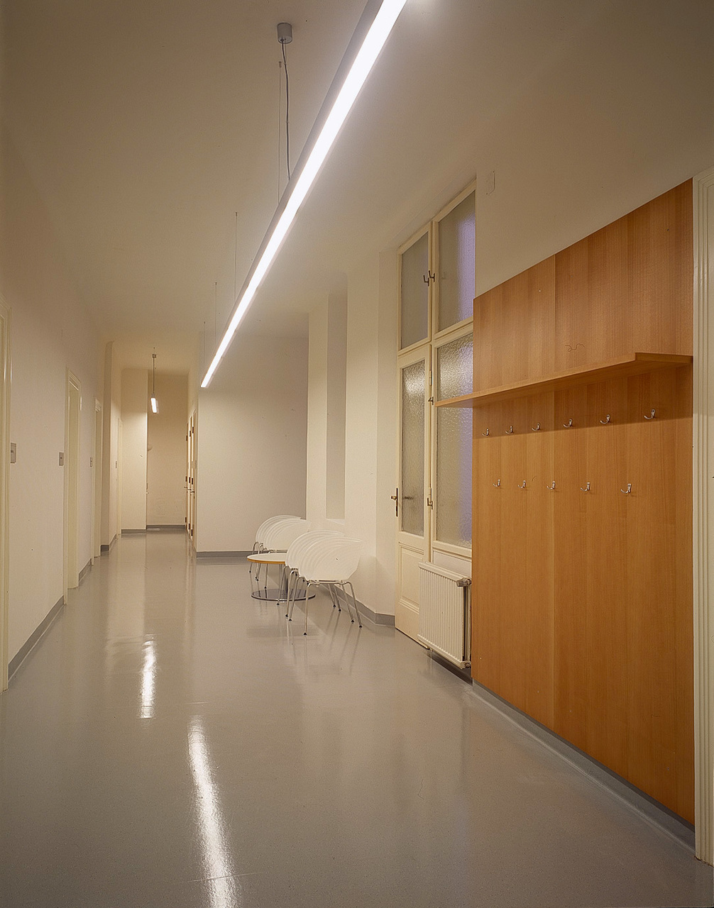 Die um die zentralen Stiegenhäuser gruppierten inneren Erschließungsgänge wurden zu als strukturierte Wege gestalteten öffentlichen Bereichen, die einerseits die Untersuchungsräume und andererseits die Büroräume erschließen.